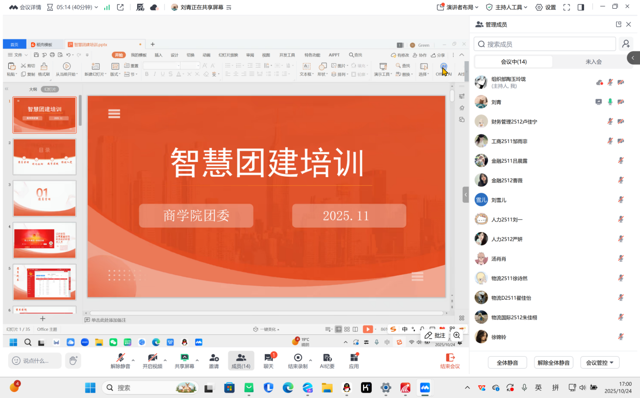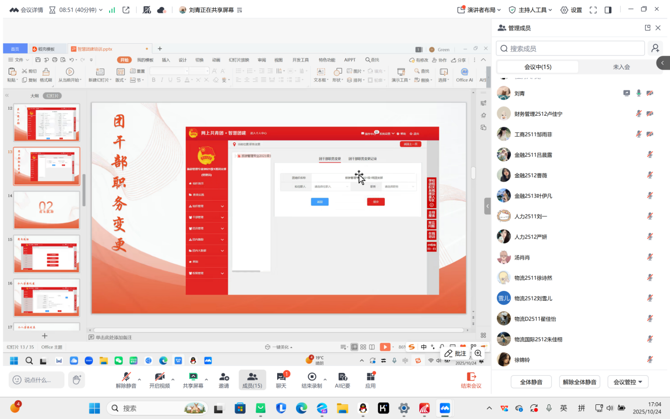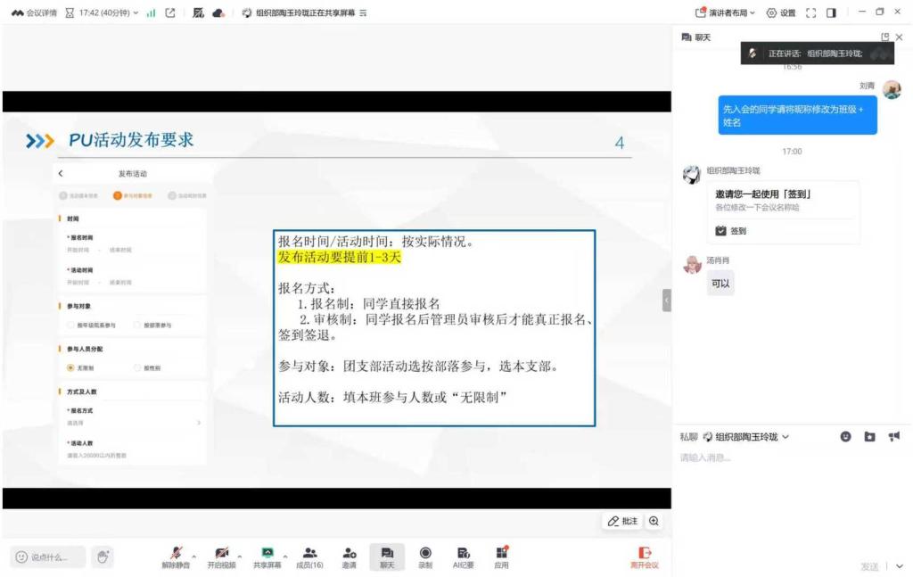 2025年10月24日17时,bevictor1946韦德官网石湖校区bevictor1946韦德官网25级新生团支书和相关负责人在线上腾讯会议成功举行了一场面向新生团支书的技能培训会议。会议主要围绕智慧团建系统操作、PU口袋校园活动发布及材料收集规范三大板块展开讲解。三位负责人分别就各自负责的模块进行了详细说明,并提供了后续答疑支持。