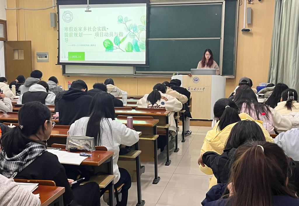 为鼓励员工利用寒假参与社会实践,提升综合素质与实践能力,12月8日,工商25、财管25、人力25、物流25班级开展寒假社会实践返家乡项目动员主题班会。