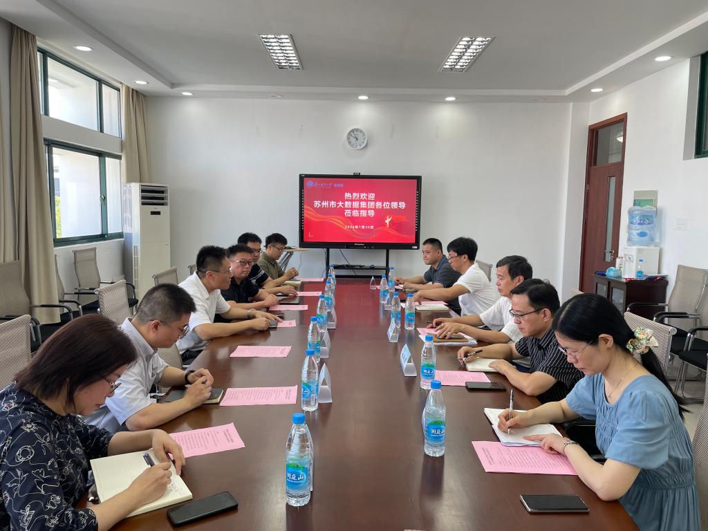 7月30日,苏州市大数据集团来公司开展校企合作交流,苏州市信息中心应用推进科科长过岱彦、苏州市大数据集团世纪飞越公司总经理吴文斌、副总经理石小建、苏州市大数据集团苏商通平台运营总监沈志岗、项目经理谢家辉、优凡科技总经理张君丽等参加交流会。院全体班子成员参加调研交流。