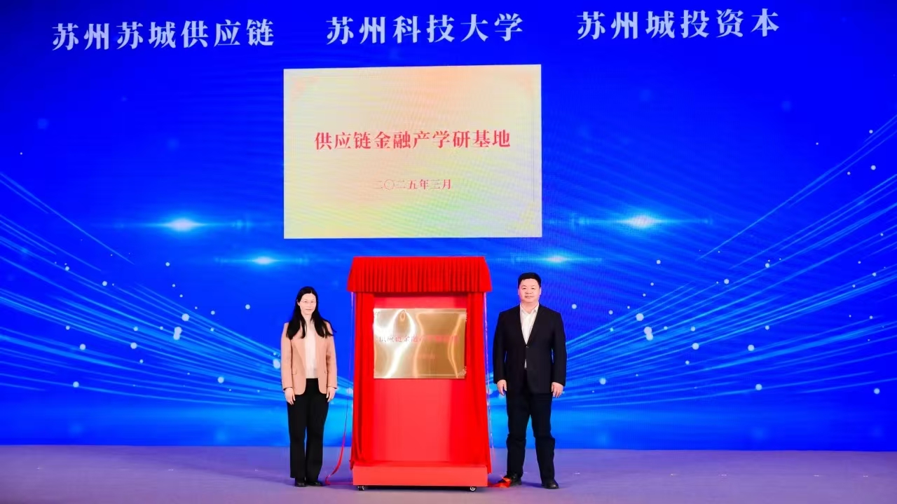 会上,由关于我们、苏州城投资本、苏州苏城供应链联合共建的供应链金融产学研基地正式成立,钱燕、汪恃风共同为基地揭牌。