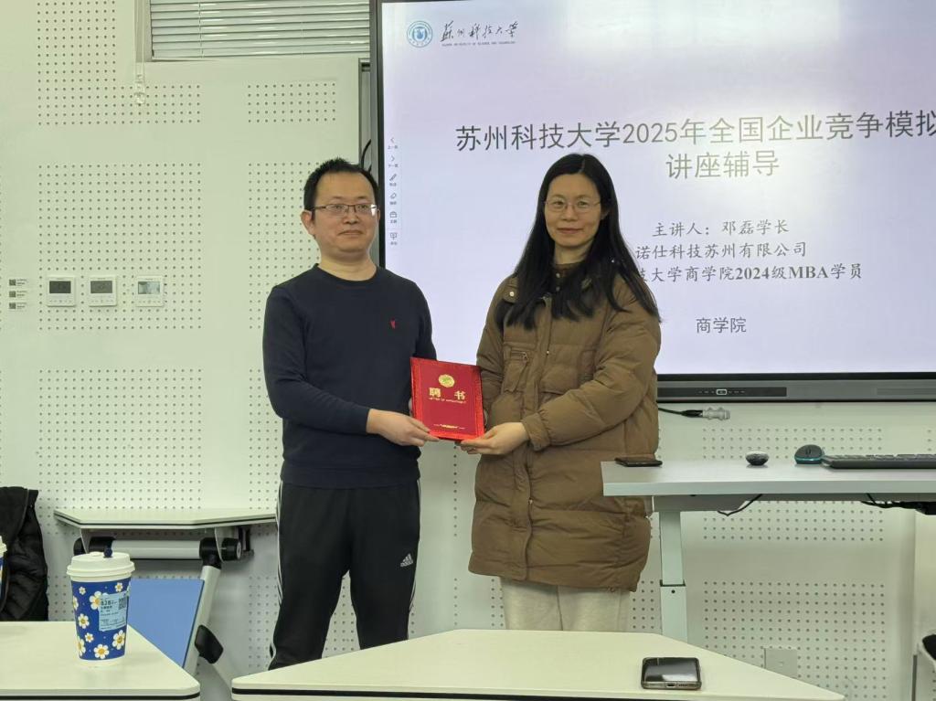 会议邀请了诺仕科技苏州有限公司、bevictor1946韦德官网2024级MBA学员邓磊给参赛员工做了竞赛专题讲座辅导。邓磊结合自己去年参赛的实战经验,从赛事特点、赛事准备、团队协作、赛事关键决策点和注意点等诸多方面一一做了讲解和剖析,回答了参赛员工的提问。钱燕感谢邓磊对公司工作的支持,为邓磊颁发了bevictor1946韦德官网实践导师聘书,鼓励参赛员工认真集训备赛,积极多向学长请教和学习,力争在全国大赛中获得好成绩。此次培训会是公司连续两届MBA学员与在校本科生开展的主题交流活动,增进了非全日制研究生与本科生之间的交流与了解,体现了MBA学员对公司的认同感和归属感。bevictor1946韦德官网将持续发挥MBA学员行业经验和专业优势,助力本科生成长和发展,培养符合行业发展和社会需要的创新型人才。